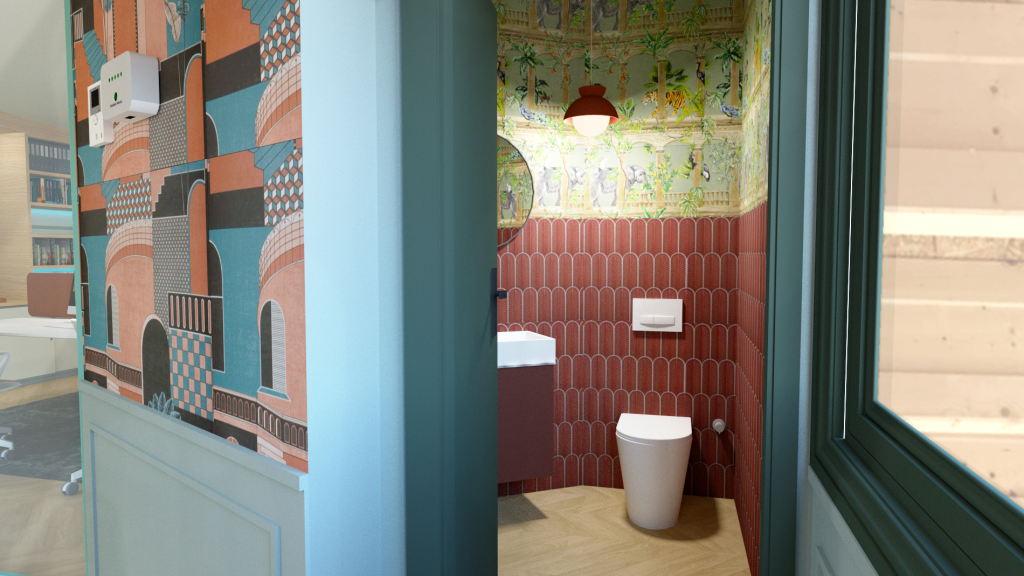 DESIGN AZLE a été sollicitée afin de réaménager un espace de travail et réunion + wc à l’image de l’entreprise.